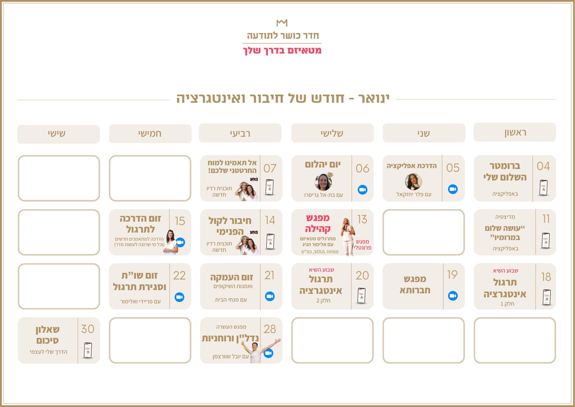 "קידוד הגשמה שינה את חיי. הצלחתי לצלול עמוק ולהתמיר דפוסים עתיקים שעיכבו אותי במשך שנים. משכתי עבודה חדשה ומדויקת שבה אני משתכרת בשפע וקמה יום יום לתקן את העולם ולהגשים היעוד שלי באושר גדול"